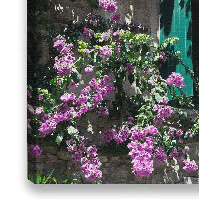 Raam overwoekerd door de bougainvillea (Bougainvillea is een geslacht uit de familie Nyctaginaceae. Soorten en kruisingen uit het geslacht worden toegepast als tuin- en kamerplant.