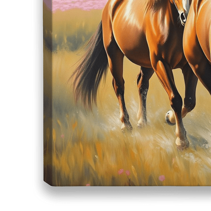 Deze afbeelding toont een verbluffende artistieke weergave van drie paarden die door een zonnige weide galopperen. De scène is doordrenkt met een gevoel van vitaliteit en vrijheid, terwijl de paarden met kracht en gratie bewegen. Hun rijke, kastanjebruine vachten glinsteren onder het warme zonlicht en reflecteren gouden tinten die hun gespierde vormen versterken. De voorgrond legt de dynamische beweging van spattend water onder hun hoeven vast, wat hun energie en kracht benadrukt.