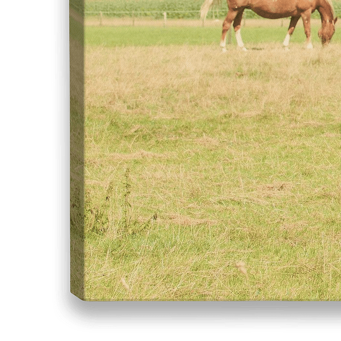 Twee paarden in een weiland met één paard groot op de voorgrond en één paard klein op de achtergrond. Een mooie Hollandse wolkenlucht met blauwe plekken op de achtergrond