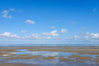 Twee paarden in de verte op het strand van Koksijde, België bij eb.