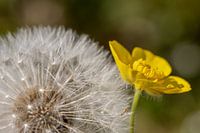 Een uit geloeide Paardenbloem vormt een witte pluisjes bol. Is een mooi contrast met de gele Boterbloem