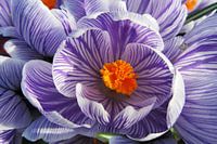 Een enkele bloem van de prachtige voorjaarsbloeiende bol Crocus sativa. Levendig paars en wit gestreepte bloemen, van dichtbij.
