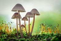 Macrofoto met een laag standpunt van een groepje lichtgekleurde paddenstoelen (grasmycena) tussen het groene mos (Atrichum undulatum). Het tegenlicht zorgt voor contrast met de hoeden en brengt sfeer in de foto.