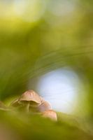 Groepje paddenstoelen in een groene setting. De fraaie hoeden steken mooi af tegen de vage achtergrond.
