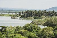 Palmbomen aan het meer van Ciénaga del Totumo, gefotografeerd vanaf de moddervulkaan El Totumo in Colombia.