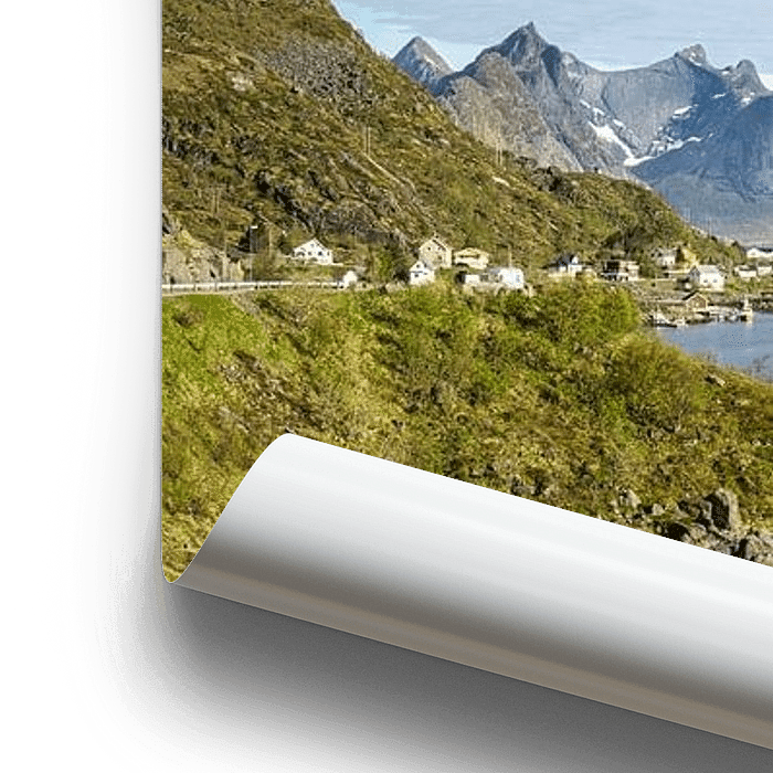 Koop dit landschapskunstwerk Panorama landschap met het dorp Reine, Noorwegen van Rietje Bulthuis op canvas, aluminium dibond, (ingelijste) fotoprint, behang en ArtFrame, op maat geprint in Fine-Art kwaliteit.