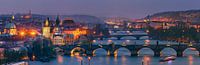 Een weids panorama beeld van een zonsondergang met uitzicht vanaf Letenske Sady over de stad Praag en de rivier de Moldau en de Karelsbrug in de Tsjechische Republiek.