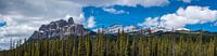 Panorama van Castle Mountain nabij Banff National Park, Canada. Eigenlijk ligt deze berg tussen Banff en De Candase Rockies. Indrukwekkend bergmassief met dennenbomen op de voorgrond. Samengesteld uit meerdere afbeeldingen om de weidsheid van het landschap te benadrukken.