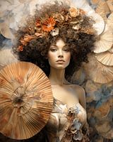 Abstract schilderij portret van een vrouw met papieren bloemen in warme aardetinten.