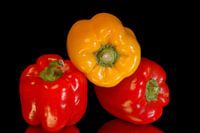 Rode en Gele Paprika op een spiegel als een stilleven met een mooie zwarte achtergrond.
