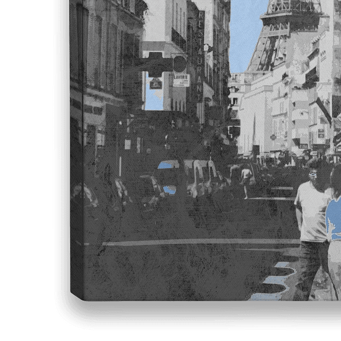 Digitale kunst gemaakt van een originele foto genomen door Imladris in Parijs, Frankrijk in 2002. Uitzicht langs een drukke stadsstraat in de richting van de Eiffeltoren. Met een vleugje blauw en een getextureerde achtergrond, voor een moderne stedelijke twist. Een geweldig souvenir van uw reis de meest romantische stad in de wereld.