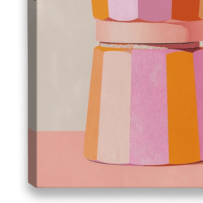 Een interpretatie van een klassieke moka pot in een verfrissend kleurenpalet van oranje, roze en zwart. Het minimalistische ontwerp met geometrische vlakken en scherpe contrasten geeft een moderne twist aan dit iconische koffiezetapparaat. De compositie straalt rust uit tegen een neutrale achtergrond, waarbij de zachte pasteltinten een…