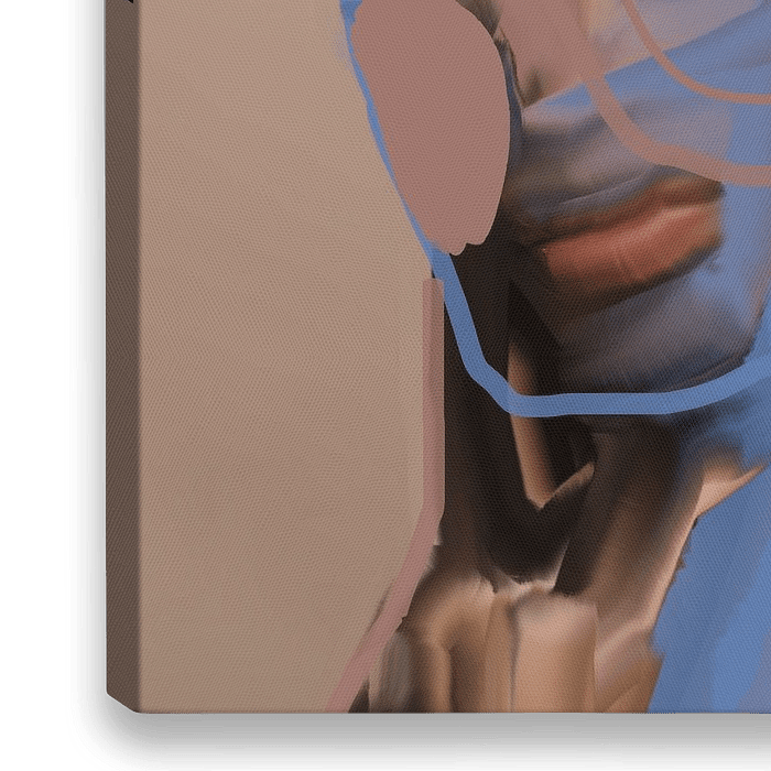 Abstract portret met de titel "Pastel mood" in pasteltinten: blauw, roze, bruin.