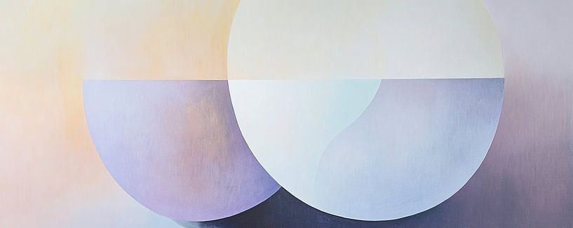 Pastelkleuren | Overlappende Pastelvormen - Dit abstracte schilderij kenmerkt zich door drie grote, overlappende cirkelvormen met een zachte overgang van pasteltinten zoals lila, lichtblauw en een warm beige.
