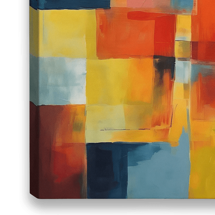 Een abstract kunstwerk met vierkante blokken in een moderne kunststijl geïnspireerd door patch en quilt structuren. Geometrische vormen en gedurfde penseelstreken creëren een compositie met levendige kleuren en warme tinten.