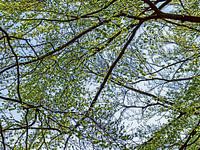 Vroeg in de lente zijn takken en takjes van de bomen nog goed te zien. De aderen van het bos steken zwart af tegen de lucht. Het jonge blad geeft kleur aan het geheel. Ik kijk vaak meer omhoog dan naar beneden in deze tijd.