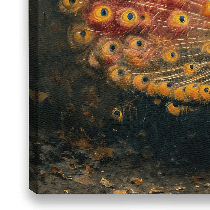 Een muurschildering als decoratieve kunst voor een stijlvol interieur. Een pauw pronkt met zijn prachtige verenkleed.