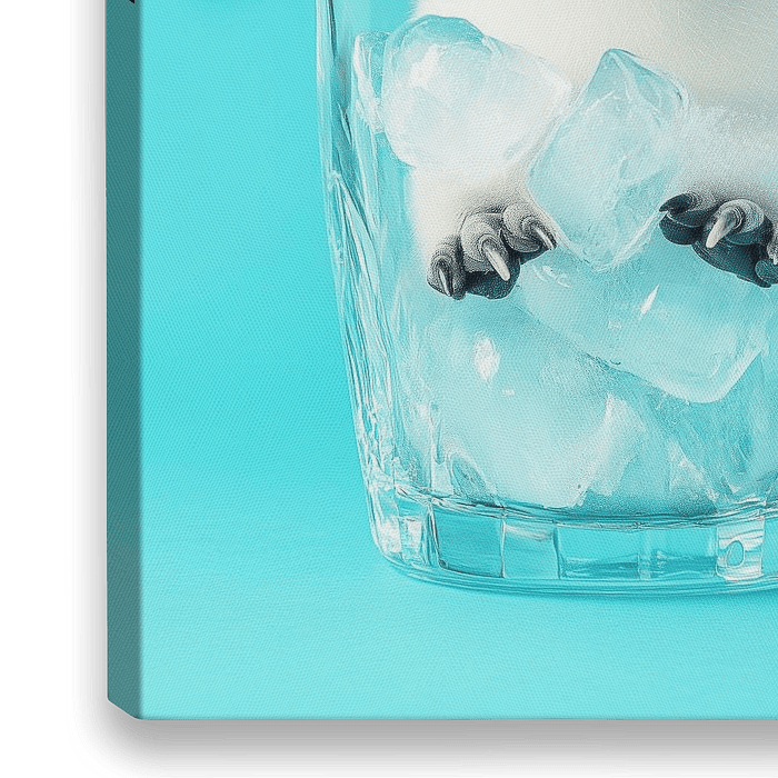 Een humoristisch portret van een baby pinguin in een glas met ijsblokjes.