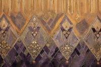 "Persephone's Wederkeer" toont een complex patroon van geometrische vormen in paarse en gouden tinten. Bovenaan het werk domineren gouden driehoeken en lijnen, terwijl de onderkant wordt gedetailleerd met paarse en gouden ruiten, elk gevuld met delicate motieven en stippen. De combinatie van kleuren en patronen roept een gevoel van…