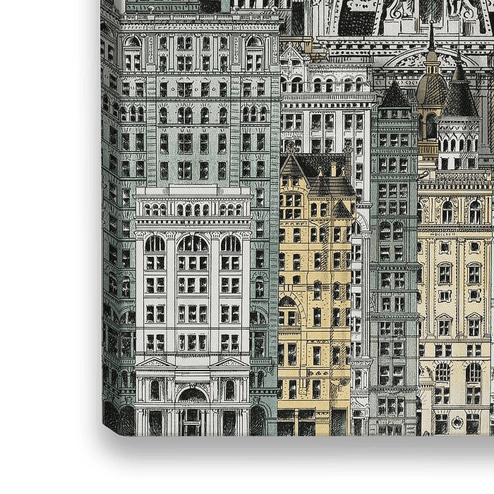 Collage van vintage illustraties van diverse skyscrapers in de Amerikaanse stad Philadelphia. Het subtiel aangebrachte 3D-effect geeft een bijzonder randje aan dit werk.