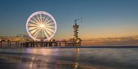 Prachtige kleuren weerkaatsen in het water tijdens de zonsondergang. Door de langzame sluitertijd zie je het rad op de pier bewegen en zorgt voor een mooi effect in de foto.