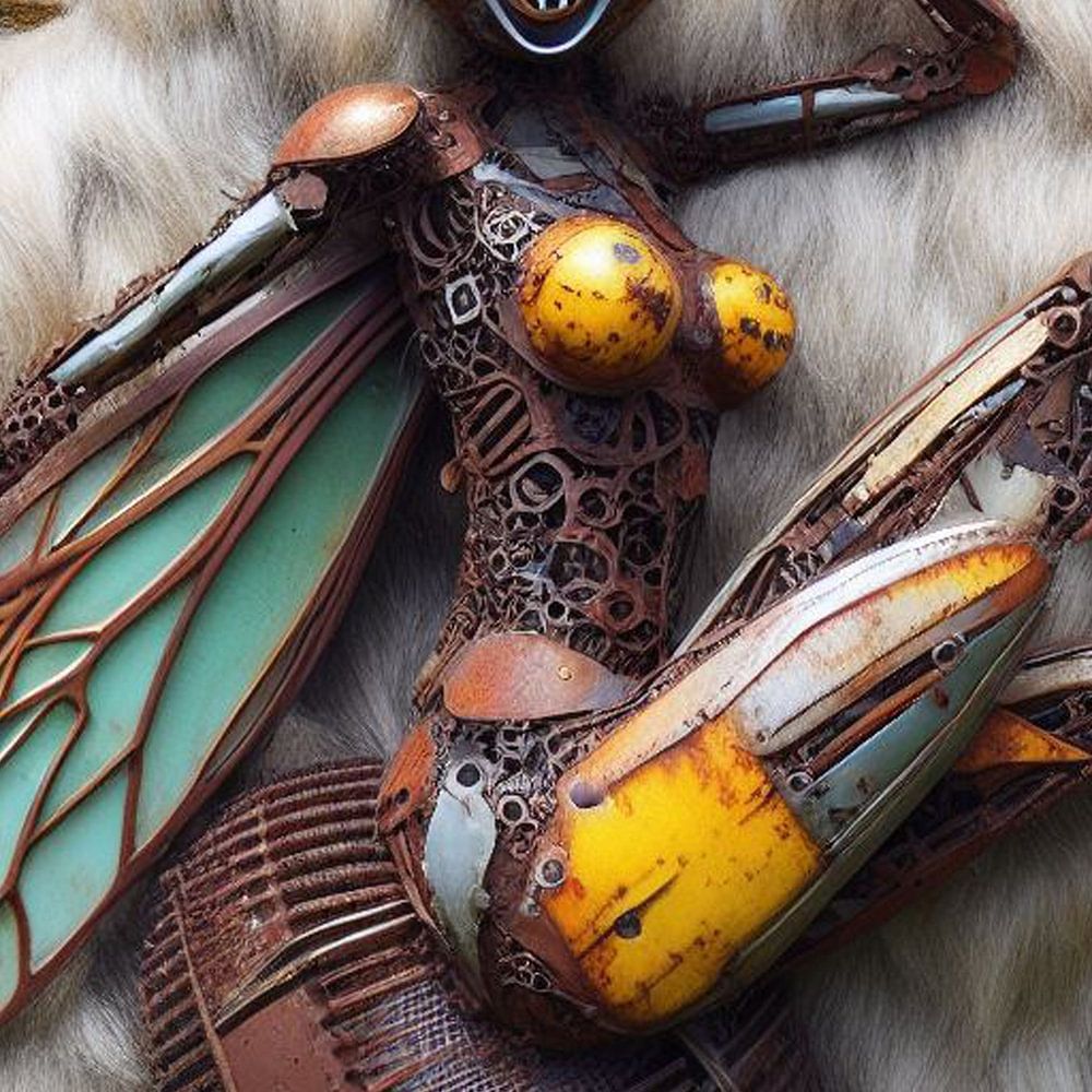 insect-pinupgirl made of old car-parts, patina, rust, oil, retro, in front of a hairy-fluffy stone-wall