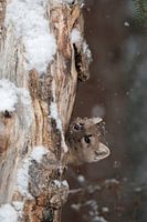 Boommarters / sparrenmarters ( Martes americana ) kijken vanuit zijn grot nieuwsgierig rond in een oude boom, wilde dieren, Yellowstone NP, USA. Grappig plaatje, mooie wintersfeer.