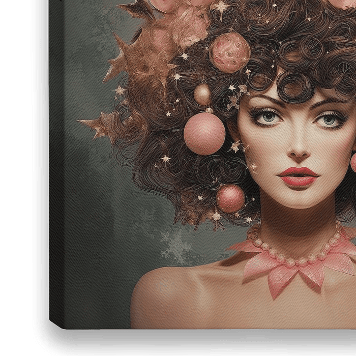 Afbeelding van een mooie vrouw met een roze met goud kerstboom op haar hoofd. Vage kerststerren vermengd in de achtergrond complementeren het geheel. Nostalgisch en zoet. Passend bij diverse stijlen, waaronder kerst en winter.