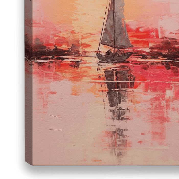 Dit werk toont een eenzaam zeilschip dat zijn weg baant over kalme wateren, met de stralende schakeringen van de dageraad die zich weerspiegelen op het wateroppervlak. De horizon is gevuld met warme rode en zachte gele tinten die de stilte van de ochtend benadrukken. De abstracte weergave van het water en de lucht zorgen voor een…