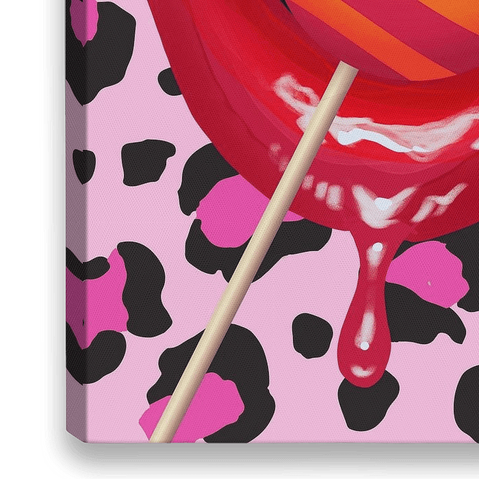 Dit unieke ontwerp met grote mond en lippen met lolly en roze panterprint op de achtergrond.