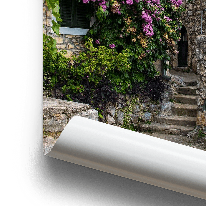 Pittoresk straatje op het eiland Krk, Kroatië. De eilanden aan de Dalmatische kust hebben ieder hun eigen karakter en zijn leuk om te bezoeken. Hier een mooi hoekje met de bloeiende bougainville.
