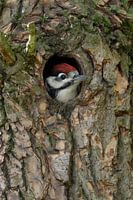 Grote bonte specht (Dendrocopos major), jonge vogel, die uit de spechtengrot kijkt, wilde dieren, Europa. De foto is genomen vlak voor de eerste vlucht van de vogel.