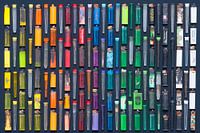 Een compositie gesorteerd op kleur van aanstekers en jointbuisjes die in Amsterdam uit het water zijn gevist.