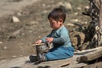 Een oud blik is genoeg voor deze kleine kerel om lekker mee te trommelen.