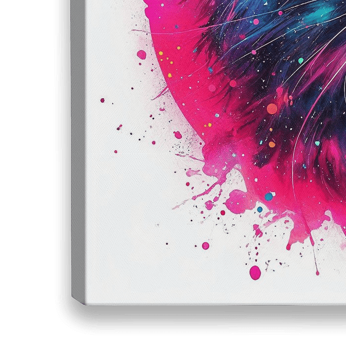 Een aquarel van een lief poesenkopje in felle neon kleuren gemaakt met A. I. art en digitaal bewerkt met Photoshop.