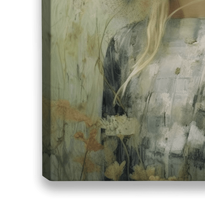 Poëtisch portret in matte pastelkleuren van een meisje in een bloemenveld tussen het fluitenkruid. Een prachtig werk voor aan je muur, mooi in ieder formaat!