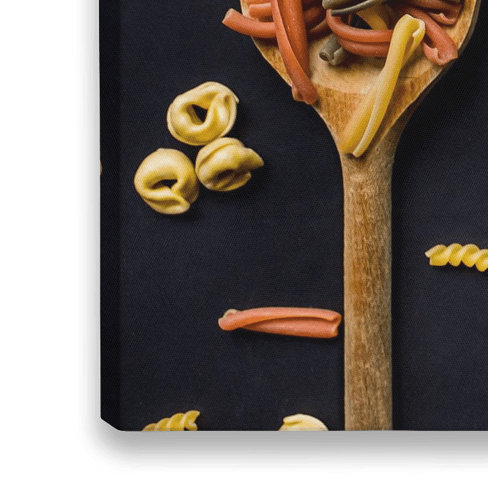 Italiaanse pasta zoals spaghetti, macaroni, spirali en tortelini in verschillende kleuren. Rood, wit groen zij de kleuren van de Italiaanse vlag. Een blaadje basilicum voor de decoratie. Als een lay flat gefotografeerd op een zwarte achtergrond. De pasta ligt op verschillende houten pollepels. Een mooi vorm gegeven palet. Klaar voor een geurig en kruidige ultieme smaaksensatie in de italiaanse keuken.