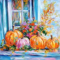 Koop dit schilderij Pompoenen voor het raam van ARTemberaubend als reproductie op canvas, aluminium dibond, (ingelijste) fotoprint, behang en ArtFrame, op maat geprint in Fine-Art kwaliteit.