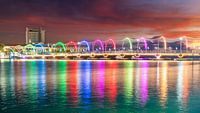 De lucht kleurt prachtig oranje en de verschillende kleuren verlichting van de brug weerspiegelen in het water van de Sint Annabaai.