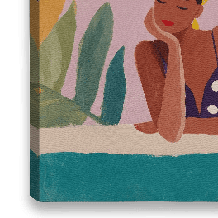 Even niks. Alleen de zon, wat palmen en het geluid van water op de achtergrond. Dromerig moment aan het zwembad met retro flair.