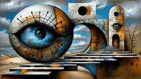 De afbeelding toont een surreëel landschap dat wordt gedomineerd door gigantische, geometrische structuren. In het midden bevindt zich een monumentaal oog dat een stadslandschap weerspiegelt in zijn binnenkant. De iris van het oog lijkt op een venster naar een verre, futuristische wereld en de netlijnen die zich over het oog uitstrekken…