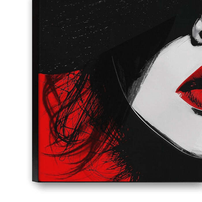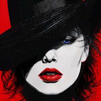 Het portret toont een stijlvolle vrouw met een grote zwarte hoed die deels haar gezicht verbergt, terwijl haar felrode lippen de aandacht trekken als een vurige handtekening van zelfvertrouwen. De strakke contrasten tussen zwart, wit en rood brengen spanning en verfijning samen in één krachtig beeld.
