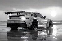Op de zwart-wit foto staat een Porsche 911 GT2, die kracht en verfijning uitstraalt. De lage, brede carrosserie met uitgesproken wielkasten en gedurfde lijnen komt duidelijk naar voren. Grote luchtinlaten en een prominente achtervleugel benadrukken zijn race-inspiratie. De glanzende velgen en het Porsche-embleem glinsteren subtiel.…