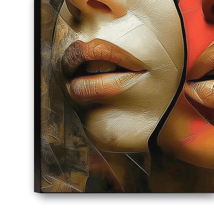 Fascinerende fusie van drie verschillende vrouwelijke gezichten, elk afgebeeld met unieke kleurstellingen en patronen, samengevoegd tot een symmetrische compositie. De krachtige lijnen die de gezichten scheiden, creëren een gevoel van zowel verbinding als scheiding tussen de verschillende entiteiten. De textuur en het kleurenpalet, dat varieert van warme aardetinten tot koelere blauwe en rode accenten, suggereren een rijke tapestrie van menselijke emoties en identiteiten.