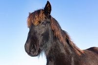 Portret hoofd zwart fries paard met blauwe lucht in winter. Dit nog jonge friese paard heb ik gefotografeerd in de winter op een zonnige dag. Het dier was nieuwsgierig en kwam naar mij toe.