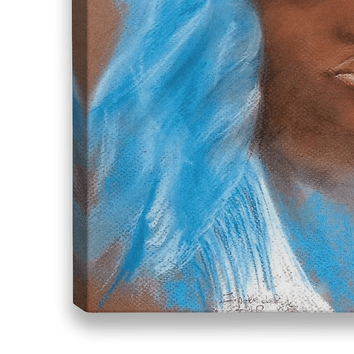 Portret / Vrouw / Pastelkrijt / Schilderij /Pastel tekening / Afrika / The Gamba / Land in Afrika / Kijken / Cultuur / Hoofddoek / Blauw / Bruin / Mooie mensen / Ogen / Donkere ogen /