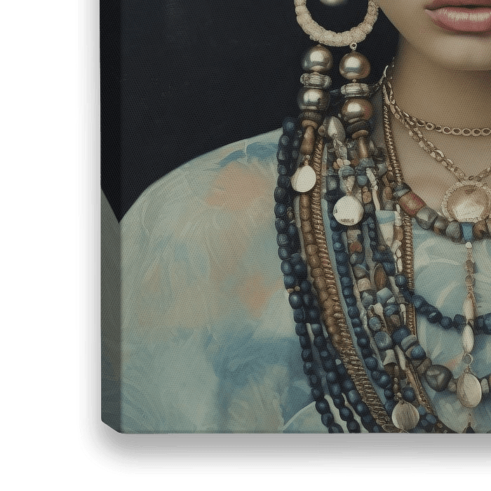 Bijzonder portret in zachte blauwtinten van een blond meisje met ethnische sieraden. Een echte blikvanger voor je interieur! Kies zelf de afmeting en het materiaal.