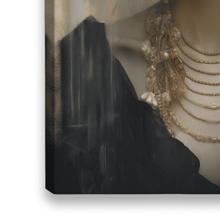 Portret modern chic met een vleugje goud. Dit digitale kunstwerk is een echte blikvanger. Kies zelf het formaat en materiaal voor dit portret. In zwart, bruin- en goudtinten.
