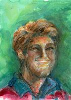 Mixed medium portret van een vrolijk kijkende jongeman. Ondergrond is geschilderd met aquarelverf , met daarover krijt, zwarte pen en wat goud.