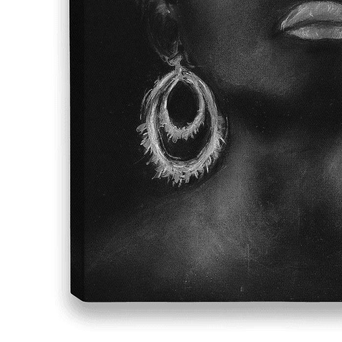Afrika /Vrouw / Portret / Zwart-Wit / Schilderij /Pastelkrijt / Oorringen / Licht / Oplichten / Schoonheid / Ogen / Trots / Zwart papier /